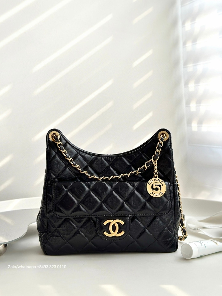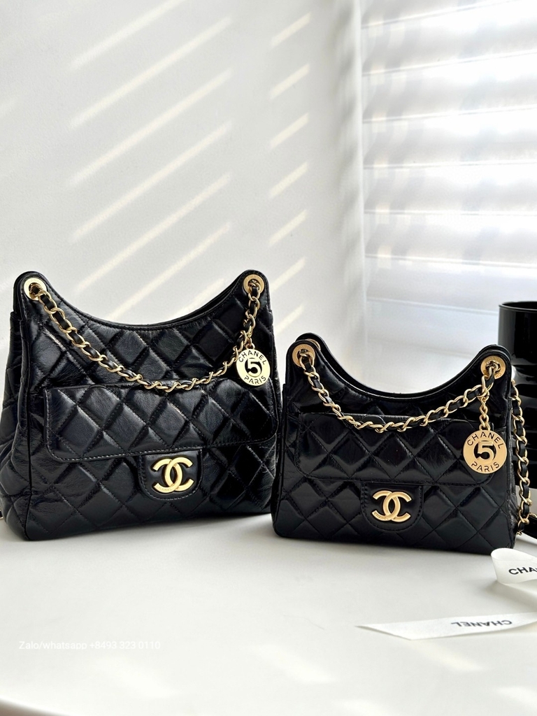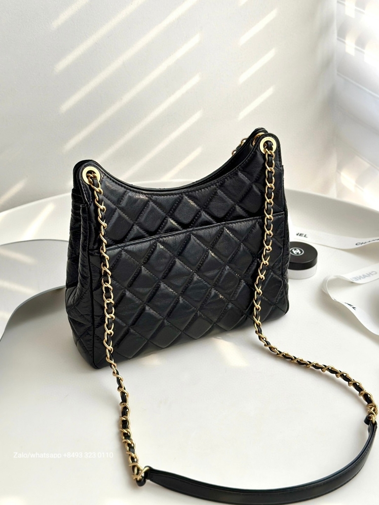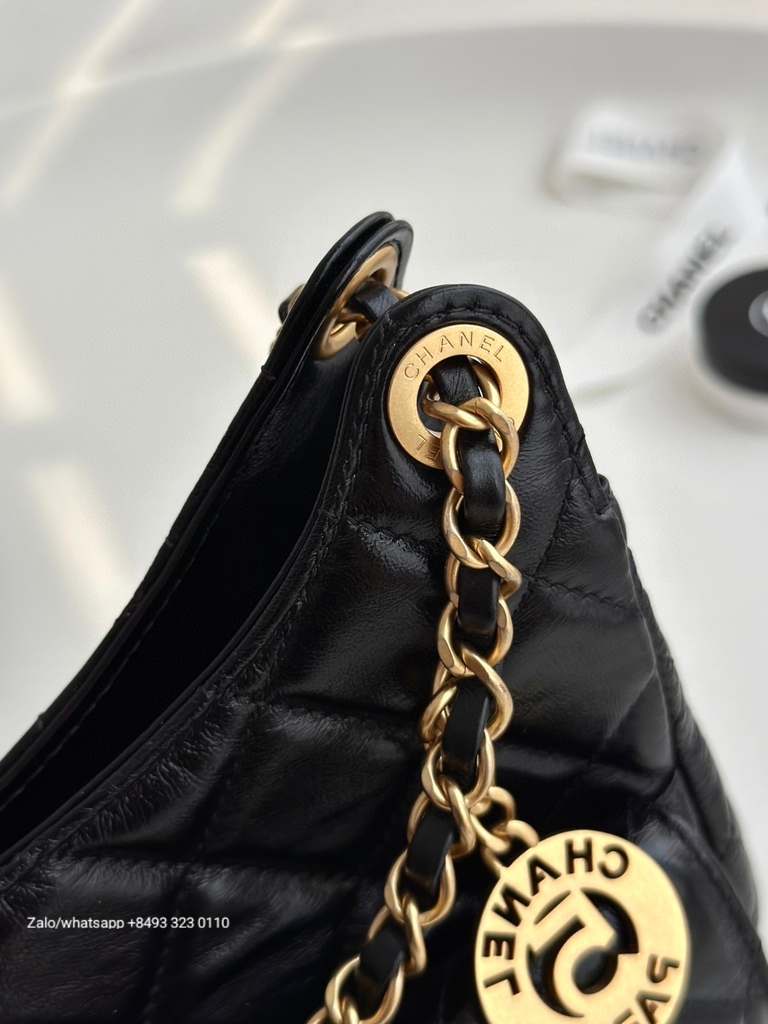 CHANEL SMALL HOBO BAG Shiny Crumpled Calfskin & Gold-Tone Metal Black AS4323 C2